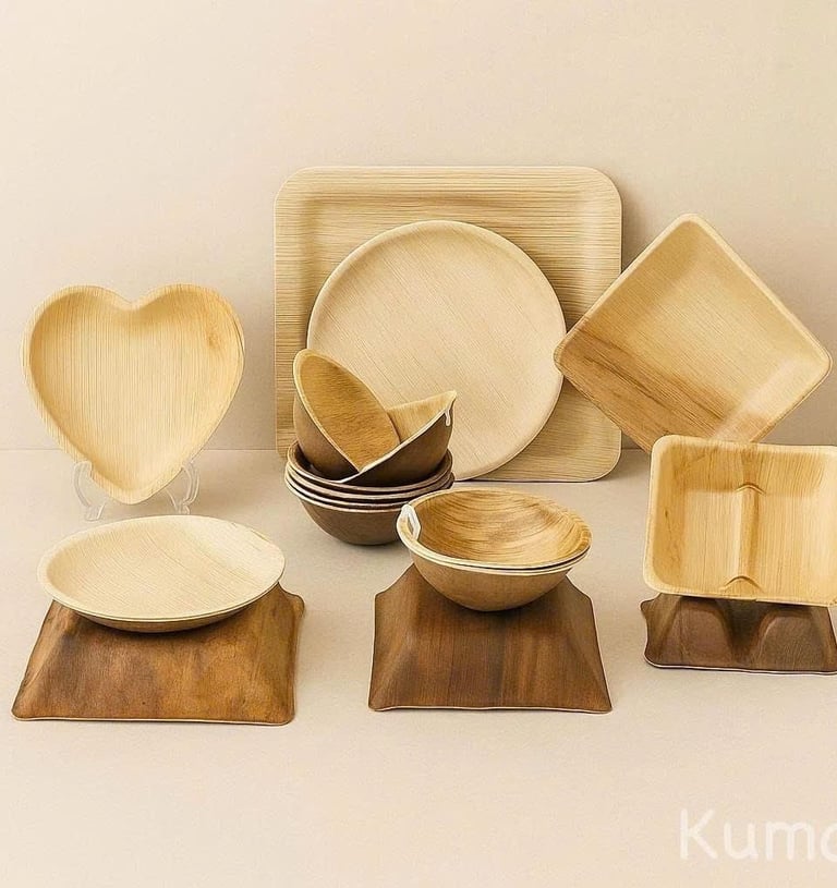 Eco-friendly, biodegradable areca leaf plates crafted from naturally fallen palm leaves.